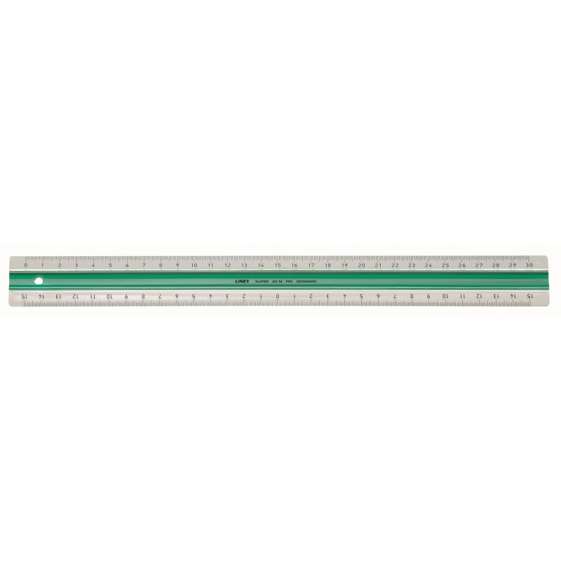 Linex legendariska superlinjal har en unik antiglidprincip, som gör den långt mer användbar och effektiv än en vanlig linjal. En inbyggd gummilist hindrar att linjalen glider på underlaget. När linjalen lutas kan den lätt föras tillbaka i läge. Indelad i mm med en 0-30 cm skala på ena sidan och en 15–0-15 cm skala på andra sidan. Med 2 fasade kanter och 1 gummilist. Material: glasklar akryl med grönt mittparti.