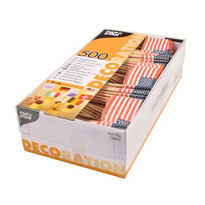 | USP | 500 st partypinnar/tårtflaggor/cocktailflaggor.|Mått på flaggan: 2,5 x 3,5 cm.|Längd på pinnen: 8 cm|Motiv: USA, amerikanska flaggan.|Material: Papper (flaggan) och trä (pinnen) |