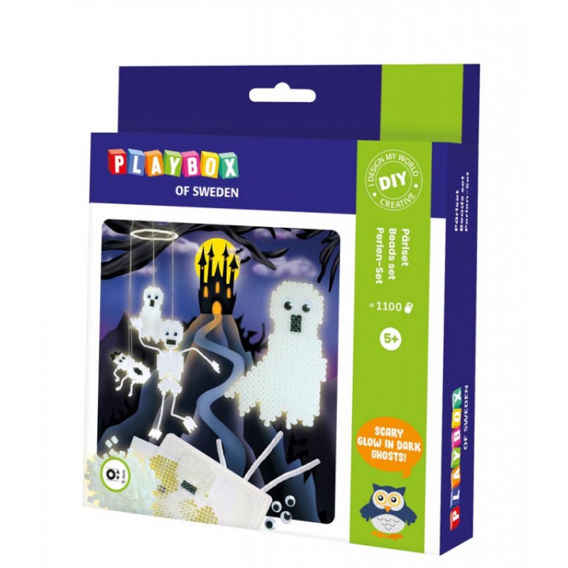 Skapa en egen spökvärld! Ett komplett set med rörpärlor och pärlplattor. Innehåller allt som behövs för att snabbt komma igång med skapandet av dina självlysande spöken som du sedan kan leka vidare med. Alla pärlplattor är transparenta, vilket gör det lätt att följa mönsterkortet som läggs under. Avsluta med att lägga på smörpapperet och stryk ihop de färdiga figurerna. En rolig aktivitet för hela familjen.