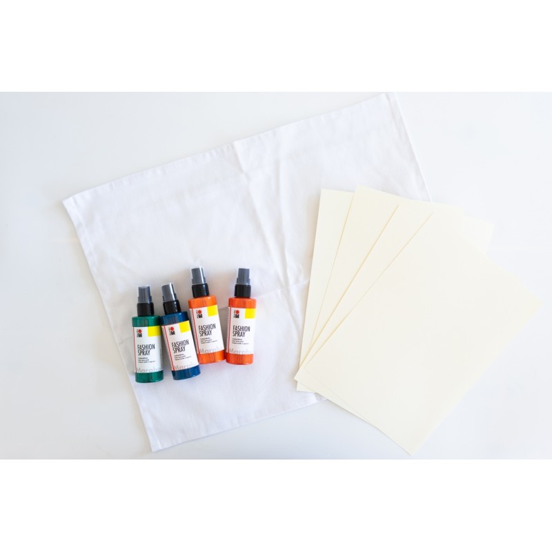 Textilsprayfärg-set med 4 st textilfärg på sprayflaska, 5 st textilväskor i bomull och 1 st maskerin..