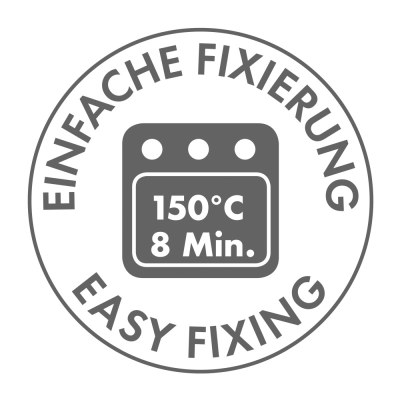 - Fixera sedan färgen i en föruppvärmd ugn i cirka 8 minuter i 150ºC, eller stryk med strykjärn med en tygbit mellan strykjärnet och textiltrycket i 3 minuter (på en yta om ca 30 x 30 cm) med "bomullstemperatur". Nu klarar färgen av att tvättas i 40 ° C.