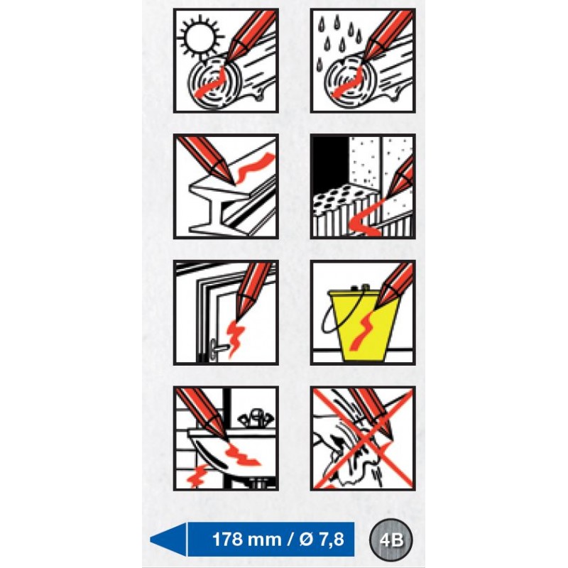 | Stiftets karaktärsdrag | Fungerar som en vanlig blyertspenna, färgen är raderbar, men vattenresistent. |